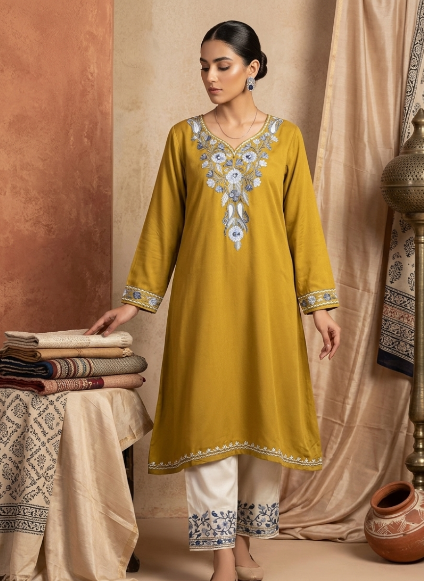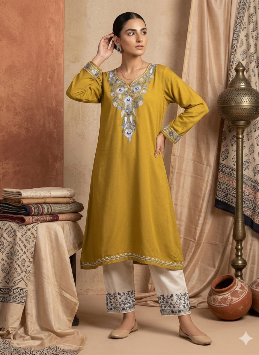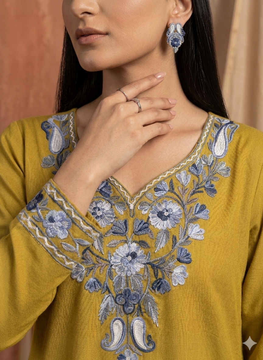 Kashmiri Aari & Sozni - Precise chain and satin stitches form tidy florals and paisleys on cotton, velvet, and wool, giving each phiran or kurta a clean, durable finish straight from the valley.