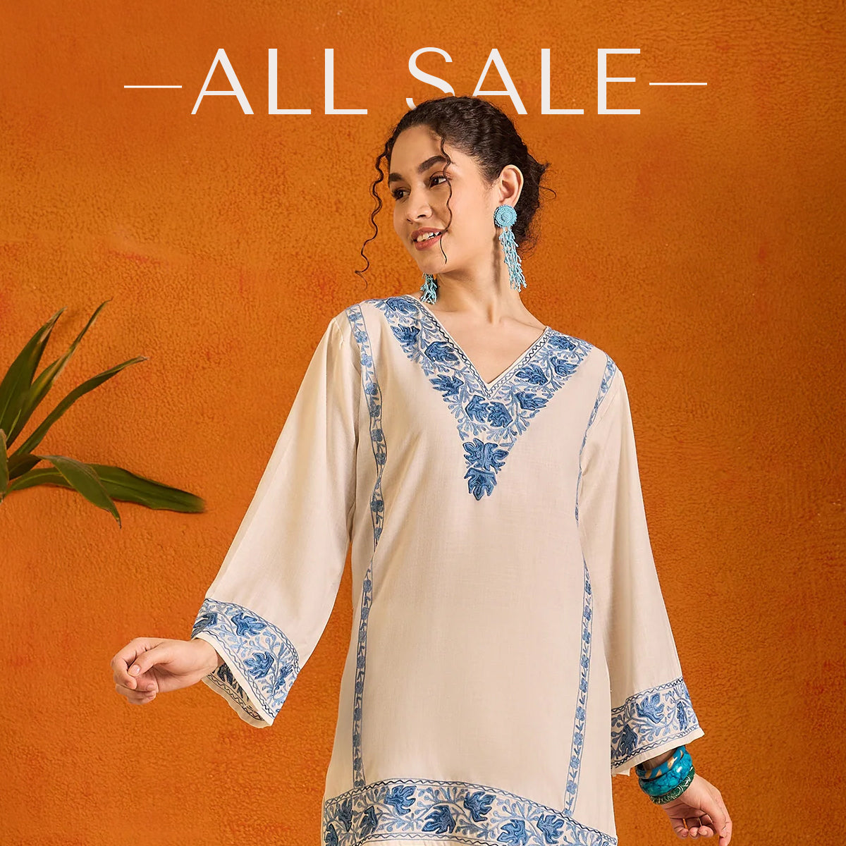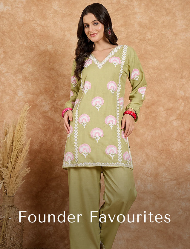 • Raabta blends Kashmiri embroidery with breezy cotton co-ords and kaftans for sunlit days.