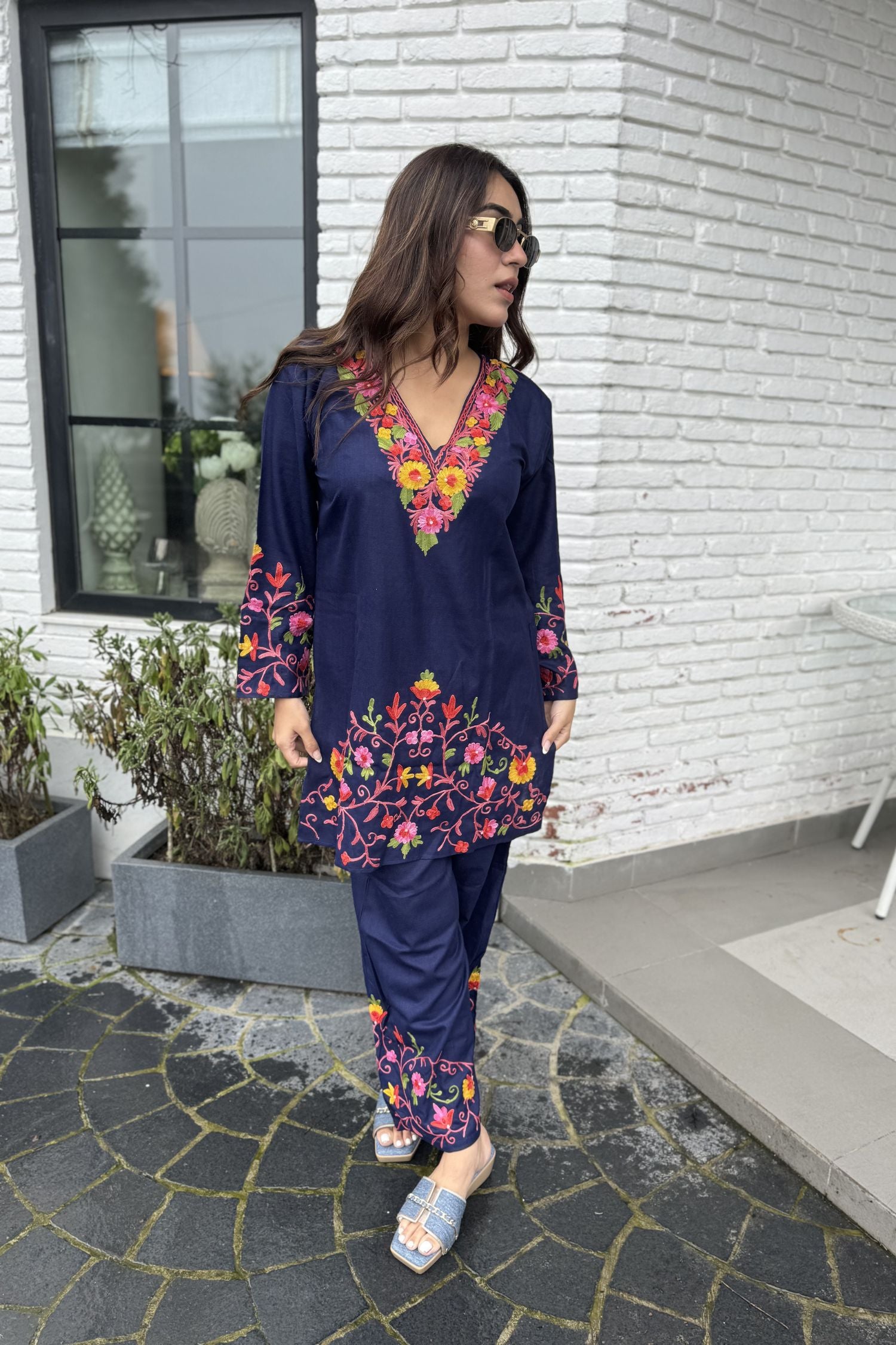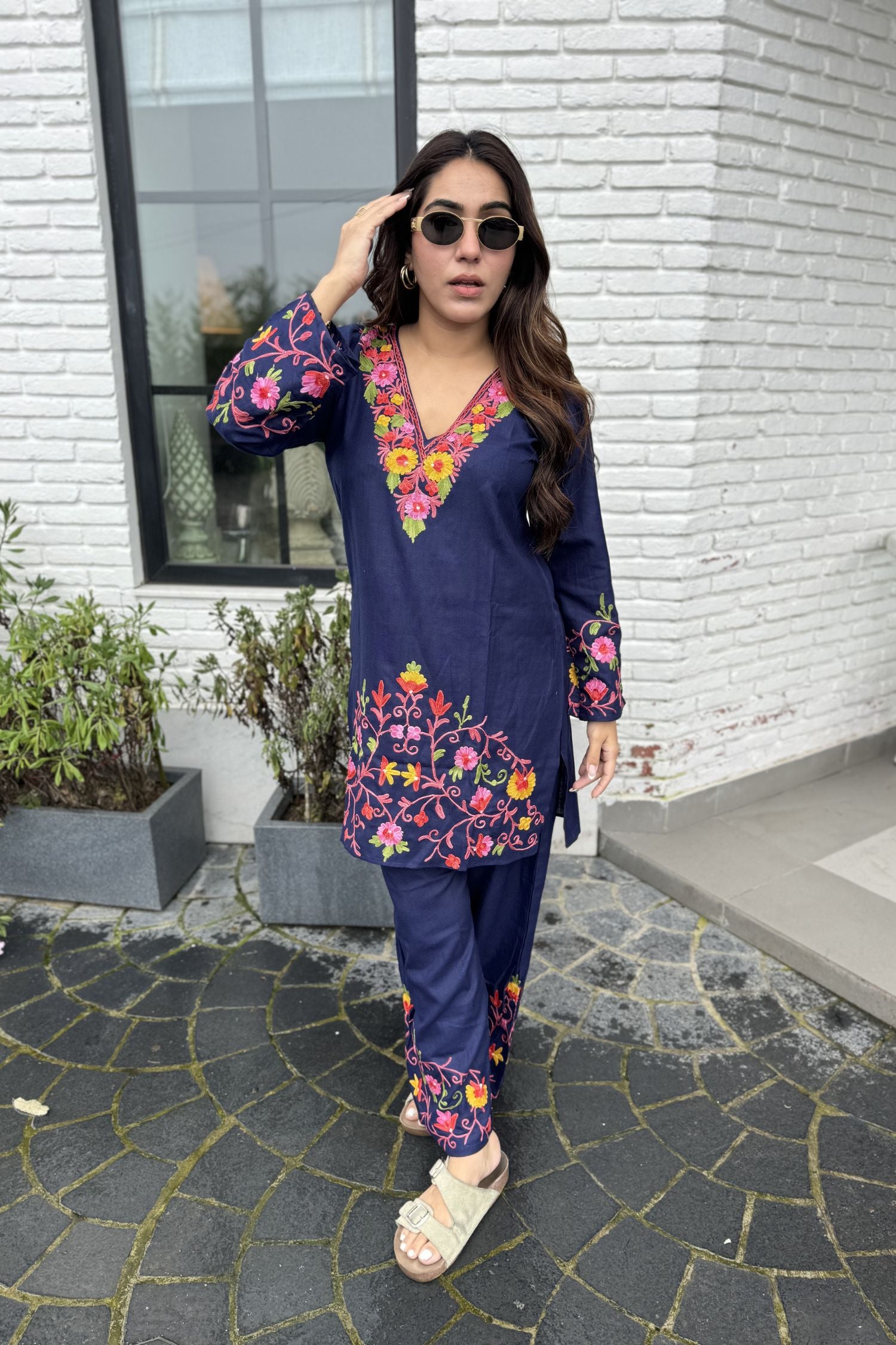 A Kashmiri kurta set is the quickest route to looking deliberate without spending the morning in front of the wardrobe wondering what to wear. The top and bottom arrive stitched in the same valley-born aari embroidery, so colors align, flowers flow across seams, and you step out feeling put together. Every stitch comes from artisan hands in Srinagar, then the panels travel to our Delhi workroom for finishing touches before reaching you in days, not weeks.