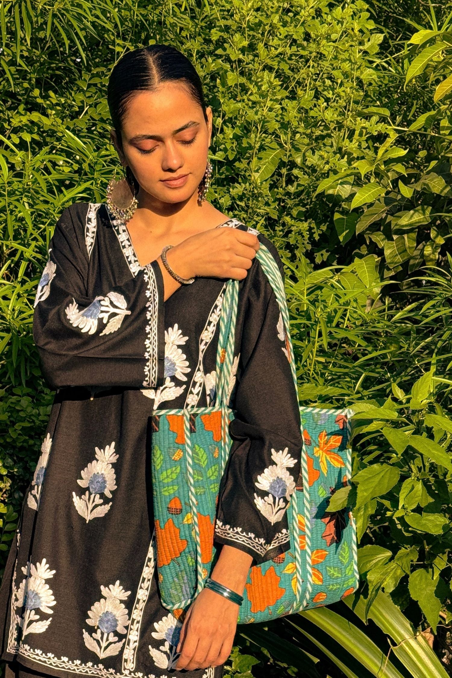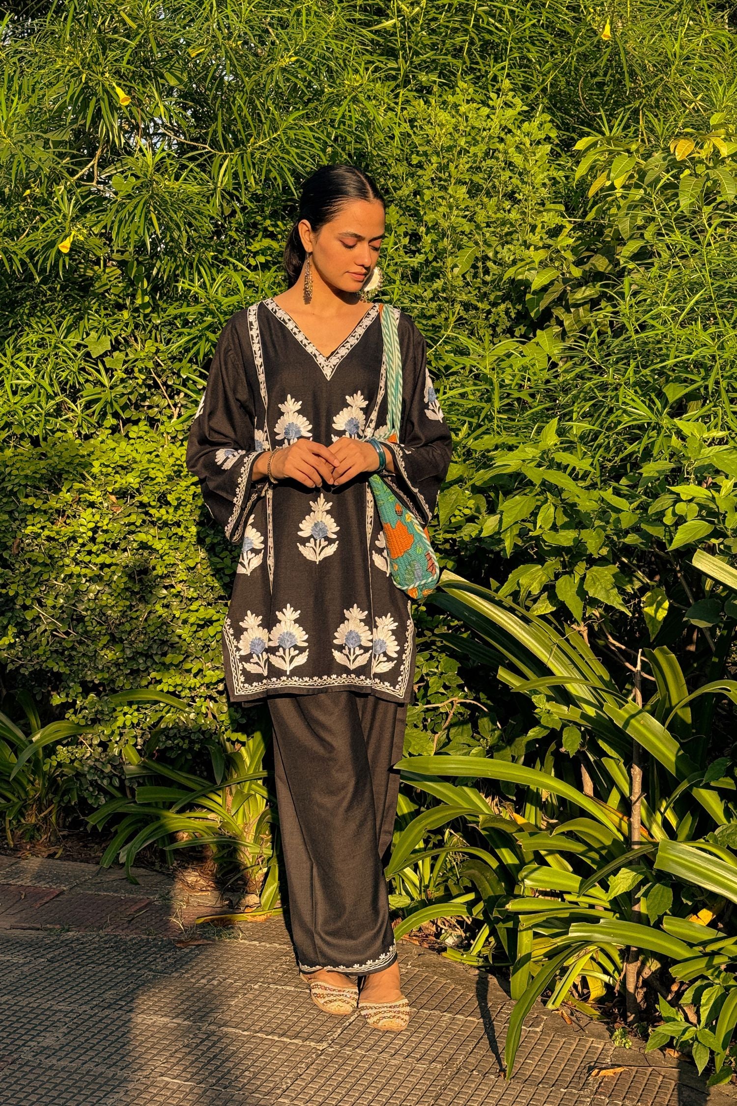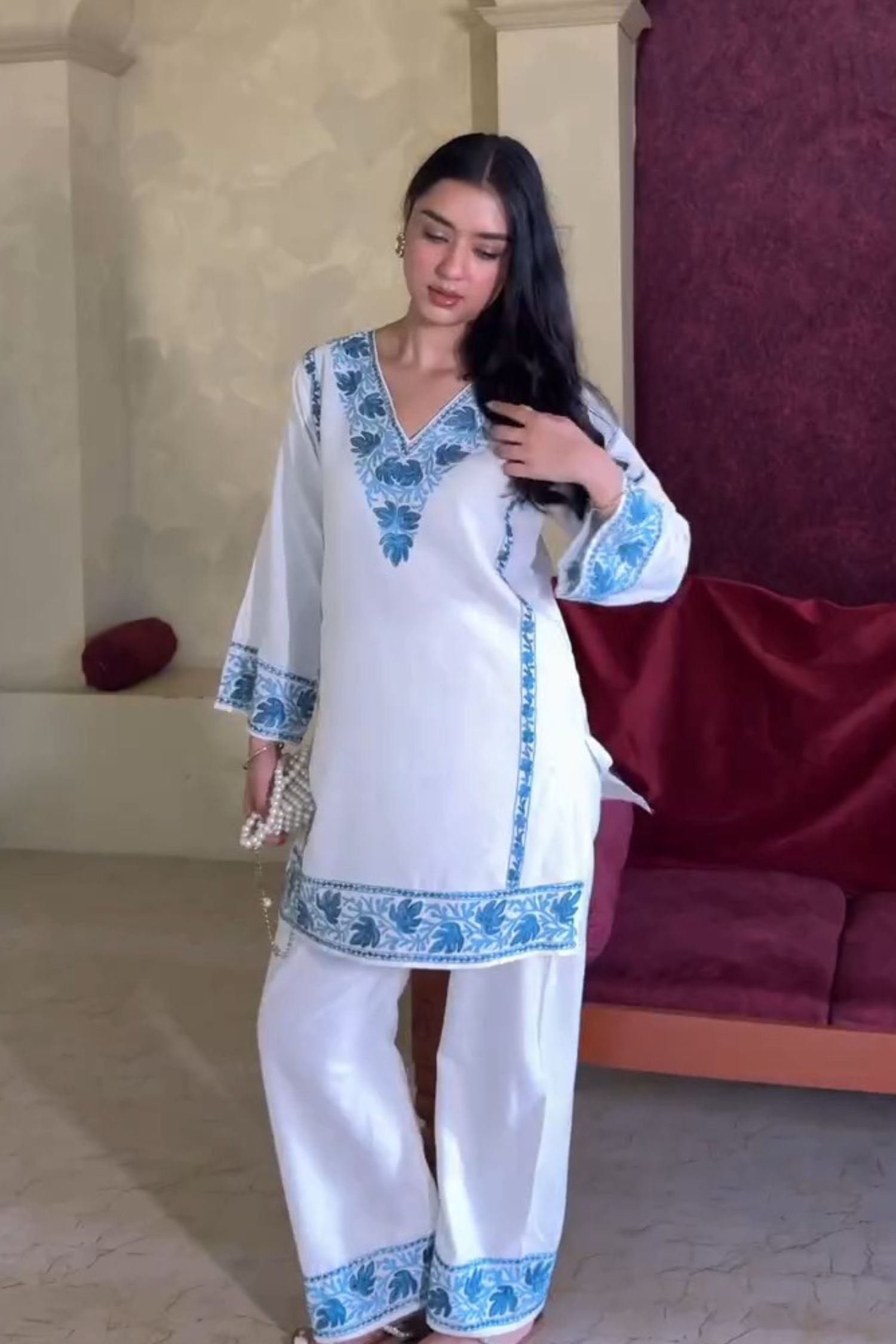 Break the pieces when you crave variety. Team the kurta with classic denim on casual Fridays, or pair the embroidered pants with a solid crop top from our cotton co-ord edit. Layer a Kashmiri phiran over the full set when winter enters the picture; roomy sleeves keep the aari vines in view while adding warmth.