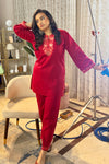 The Abroo Red Kashmiri Kurta Set is a masterpiece of traditional craftsmanship and elegance. This set includes a long-sleeved kurta and matching pants, all designed to create a cohesive and graceful ensemble. The kurta is adorned with intricate Kashmiri embroidery around the neckline and sleeve edges, featuring delicate floral motifs that highlight the rich cultural heritage of the region. The vibrant red color adds a touch of sophistication and festivity, making it ideal for special occasions and celebrations. The pants mirror the kurta’s embroidery on its borders, enhancing the overall aesthetic. The plain pants provide a perfect balance, allowing the detailed embroidery to stand out without overwhelming the look. Crafted from premium cotton fabric, the Abroo kurta set offers both comfort and style, making it a timeless addition to any wardrobe.