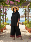 Understated, elegant, and made for sun-soaked days. The Abir Black Ajrakh Kurta Shirt Coord Set from our Saba Collection is your go-to for effortless summer style. Crafted in airy, breathable pure cotton, this set feels light, soft, and comfortable from morning to evening. The kurta-style shirt features a clean, tailored look with a smart collar and button-down front, while delicate Ajrakh print accents lend a subtle artisanal character to the classic black base.