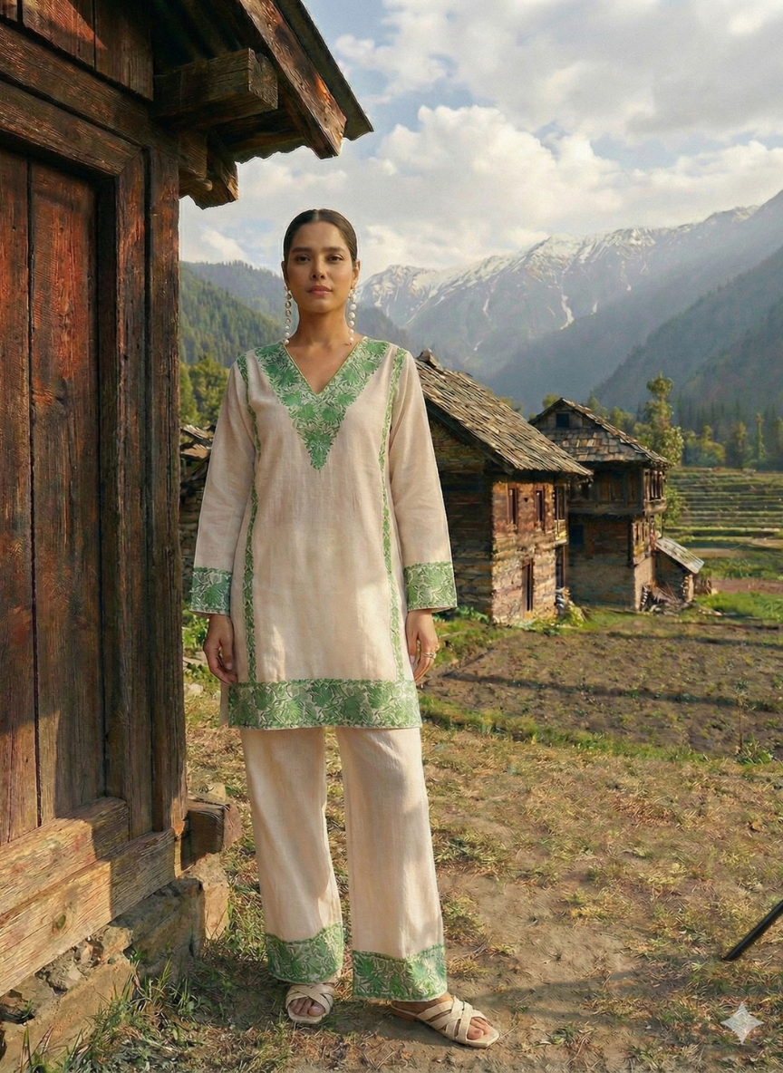 Yashmin Green Cotton Kashmiri Kurta and Pants Set