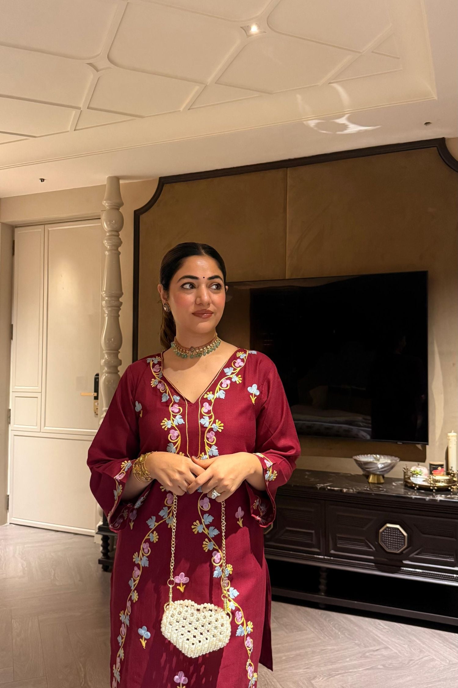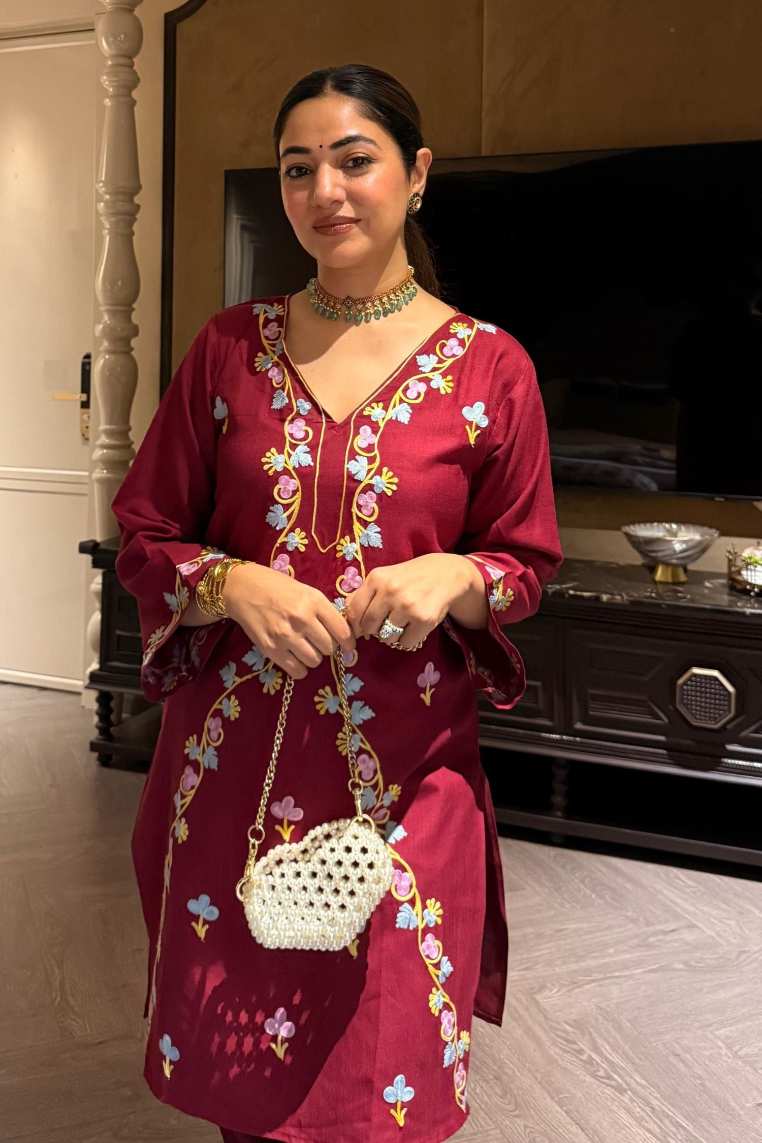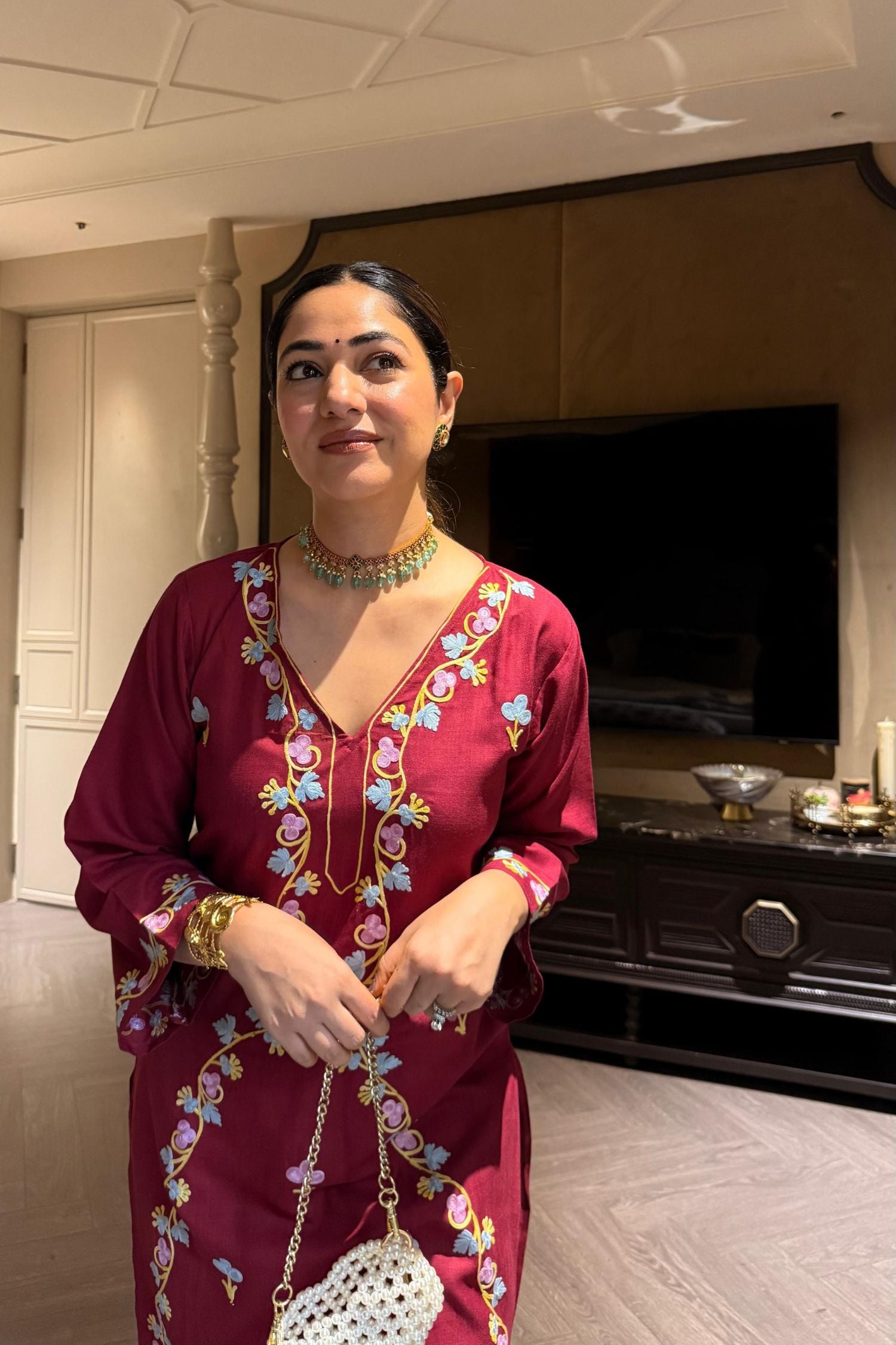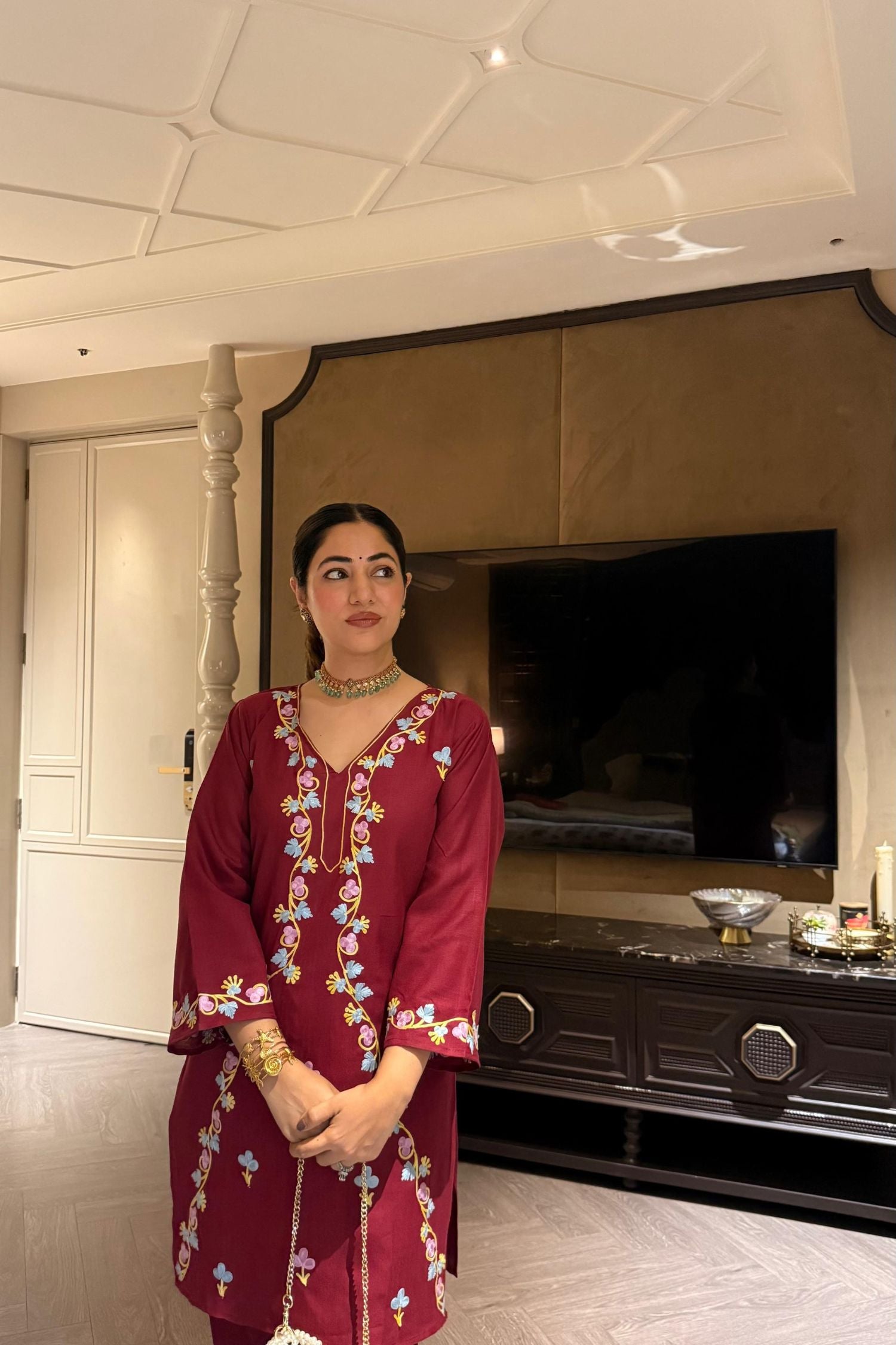 Falak Marsala Cotton Kashmiri Kurta and Pants Set