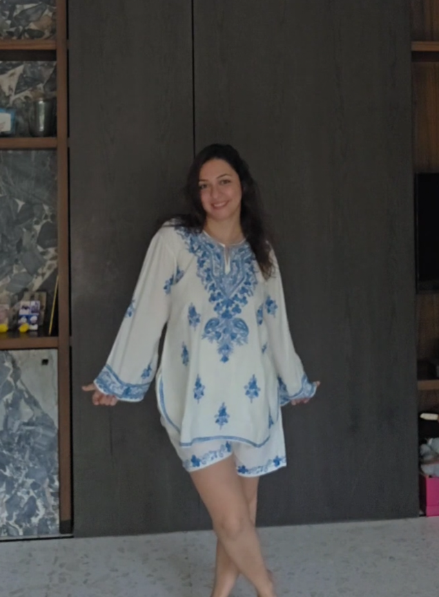 Vigya Walia in Pretty Peach Kashmiri Short Cotton Kaftan