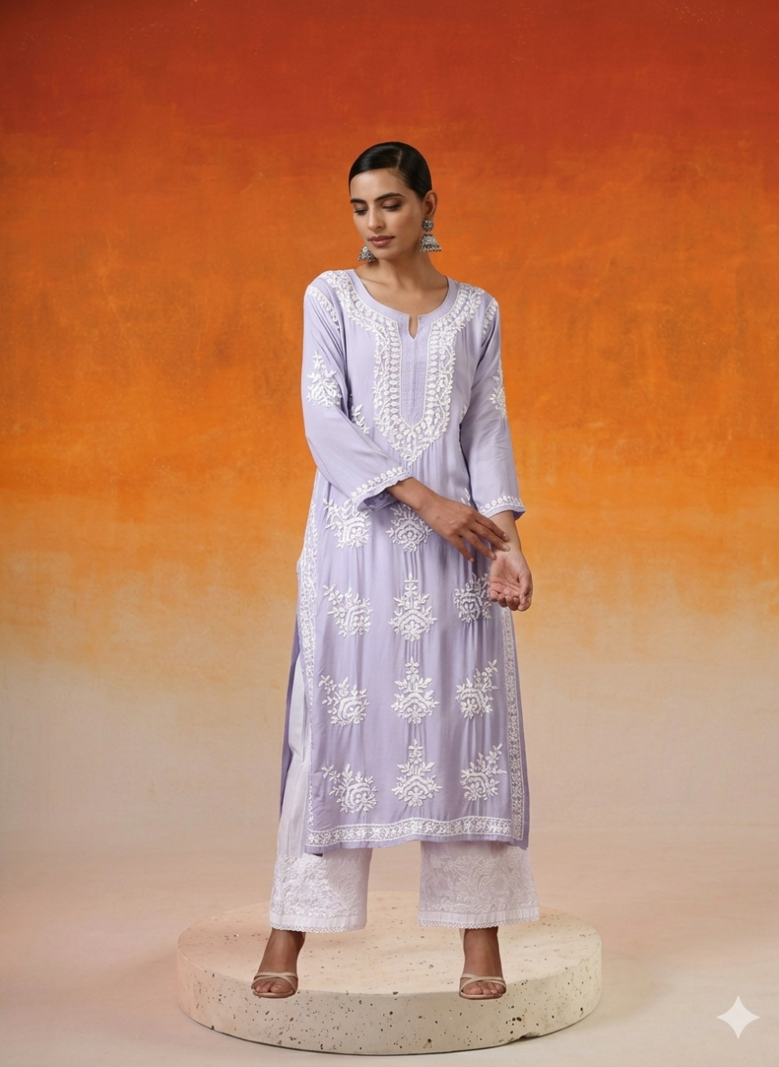Designed in the dhoti style, these pants have a unique draped silhouette that mimics the traditional Indian dhoti. The elasticated waistband ensures a snug fit while allowing flexibility and comfort. The length of the pants typically falls around the ankles, creating a graceful and flowing look.These Chikankari dhoti pants can be paired with a variety of tops, such as kurtas, tunics, Kaftans or even contemporary blouses, making them a versatile addition to any wardrobe.
