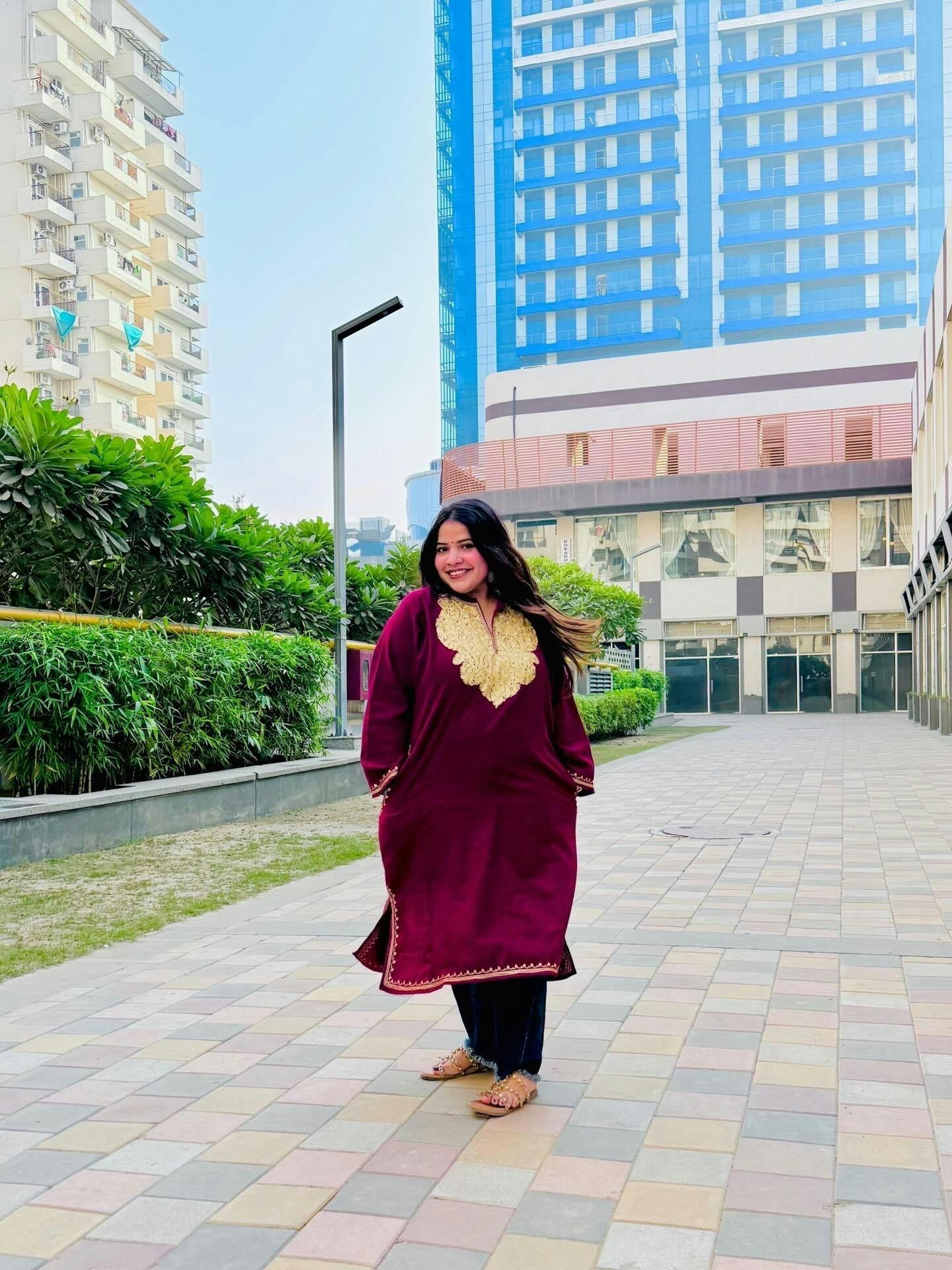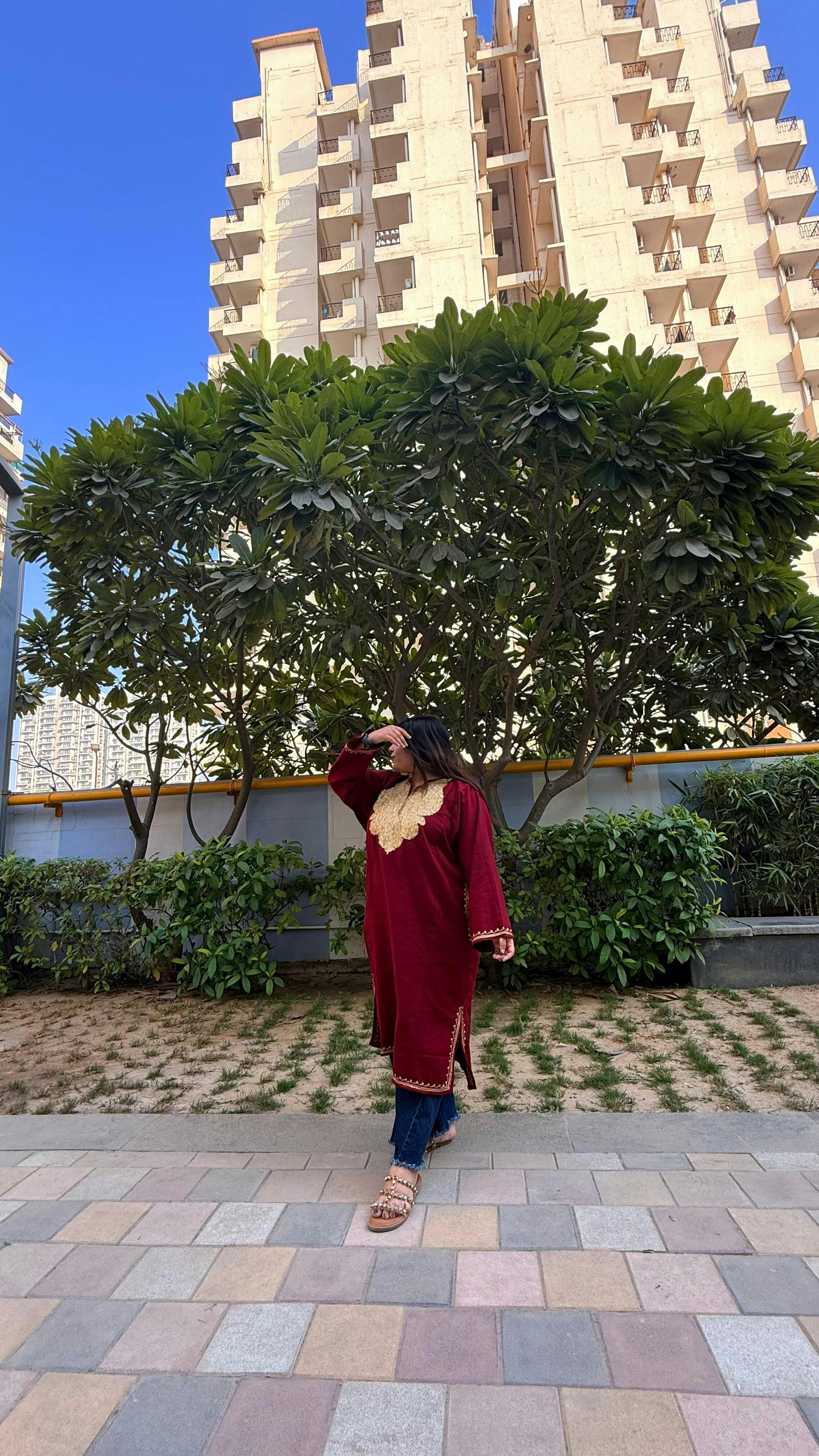 You can pair it with denim, trousers or just a simple chikankari palazzo depending on the occasion you are wearing it. Whether you're preparing for a festive event or looking to elevate your everyday style, the Amal Kashmiri Phiran is a standout piece that embodies the timeless allure of Kashmiri aari embroidery.