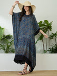 Our Anum Handblocked Ajrakh Indigo Blue Modal Silk Kaftan is a soulful tribute to the timeless art of Ajrakh, showcasing intricate hand-block printed motifs in a captivating palette of deep indigo, earthy madder, and ivory.