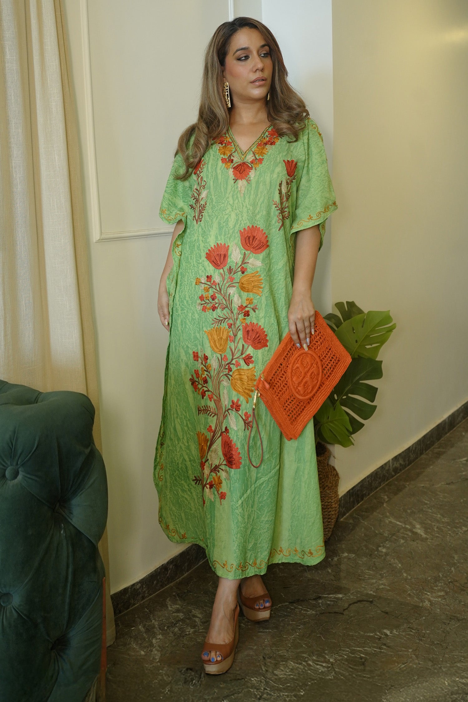 Step into understated charm with the Yashmin Green Cotton Kashmiri Kurta and Pants Set, where tradition meets a fresh, feminine flair. Crafted in soft, breathable cotton, this light parrot-green kurta is beautifully adorned with intricate Kashmiri embroidery in playful pops of pink and white. The V-neckline and straight silhouette are subtly framed with delicate thread work vines, adding grace to every stitch. The matching pants are designed for comfort without compromising on elegance, making this set a versatile choice for both casual gatherings and festive occasions.